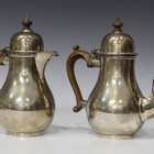 A George I style silver coffee pot and hot water pot, each of low bellied form with a hinged domed cover and turned wood finial above a wood scroll handle and scroll spout, on a circular foot, London 1957 by William Comyns & Sons Ltd, height 22cm.