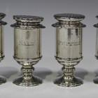 Two pairs of early 19th century Indian Colonial silver salt and pepper casters, each cylindrical body inscribed 'Salt' and 'Pepper', beneath a gadrooned rim and pierced cover, on a circular foot, Calcutta circa 1810-20 by Hamilton & Co, height 8.3cm.