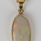 An 18ct gold and opal pendant, mounted with an oval opal, detailed '18ct', length 3.5cm, on an 18ct gold twin bar link neckchain, length 45cm.