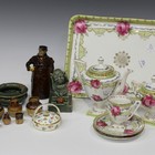 A Doulton Lambeth stoneware green glazed trump indicator, designed by Leslie Harradine, modelled as a grotesque figure kneeling above a rotating marker, impressed factory marks and 'Rd No. 540734' to base, height 9.5cm (faults), together with a similar bowl, a Royal Doulton small Kingsware Coachman flagon, height 13.5cm, a small group of other Doulton stoneware, a Mintons bone china potpourri basket, painted with scattered flowers, and a Continental porcelain part cabaret set (faults).
