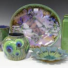 A studio pottery oval charger, decorated with stylized thistles against a mottled purple ground, impressed 'A' to base, length 43.5cm, together with a group of similar studio pottery, including a bulbous vase decorated with stylized peacock feather design and a flower petal moulded dish.