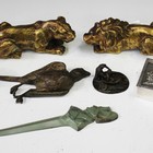 A group of collectors' items, including a plated novelty pepper in the form of an owl, height 8cm, a late 19th century cast bronze model of a bird, length 14cm, a gilt metal and faux tortoiseshell card holder and a pair of cast brass models of a lion and lioness.
