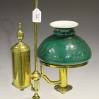 A 20th century brass adjustable student's desk lamp with a green glass shade and circular base, height 61cm.