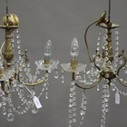 A pair of late 20th century brass three branch chandeliers, hung with glass drops, height 25cm, width 32cm.