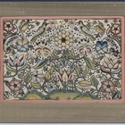 A late 17th century metal thread and silk needlework panel depicting overall stylized plants, flowerheads, fruit, scrolling tendrils, birds and butterflies, all worked in various stitches on an ivory silk ground embellished with applied metal sequins, 18.5cm x 27cm, later laid down and mounted on board.