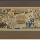 A late 17th century silkwork and chenille rectangular panel depicting a noble couple seated either side of a flaming brazier, the nobleman wearing an ermine-trimmed cloak, the lady with blue robes, seated within a landscape with cat, bellows and plants in the foreground, trees, buildings, birds and clouds in the background, worked in various stitches with coloured silks, on an ivory silk ground, 13cm x 29cm, later laid down and mounted on board.