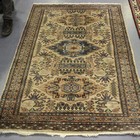 A Kashmir rug, India, late 20th century, the cream field with three shaped medallions, within a repeating gul border, 189cm x 127cm.