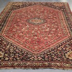 A Shiraz carpet, South-west Persia, early 20th century, the red field with overall stylized birds and guls, within charcoal spandrels and an ivory border, 304cm x 225cm.