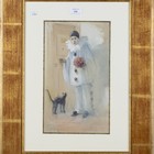 Louis Fortuney - Pierrots with Cats, a pair of watercolours with gouache over pencil, both signed recto, one with label verso, each 34cm x 20cm, both within gilt frames of wide section.