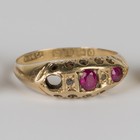 A gold and garnet ring, claw set with an oval cut garnet, ring size approx N, together with two 18ct gold rings (each lacking stones).