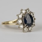 An 18ct gold, sapphire and diamond cluster ring, claw set with the cut sapphire within a surround of ten circular cut diamonds, ring size approx F1/2, sapphire weight approx 1.30ct, total diamond weight approx 0.50ct.