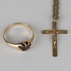 A gold and garnet set single stone ring, a 9ct gold pendant crucifix with a 9ct gold multiple link neckchain, and two gold fine link bracelets, detailed '9KT'.