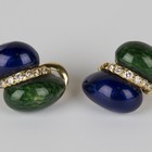 A pair of 18ct gold, diamond set and enamelled earclips, each mounted with a row of circular cut diamonds between blue and green enamelled decoration, length 2.2cm (one diamond lacking).