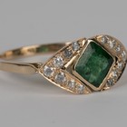 A gold, emerald and diamond ring, mounted with a square step cut emerald between circular cut diamond sides in an oval design, detailed '14c', ring size approx Q, emerald weight approx 1.00ct, total diamond weight approx 0.40ct.