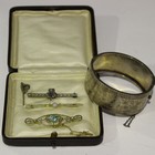 A gold, seed pearl and blue gem set bar brooch, detailed '9ct', fitted with a safety chain, a gold, opal and seed pearl bar brooch, a marcasite silver bar brooch, a seed pearl stick pin with a harp motif and a Victorian silver oval hinged bangle with floral engraved decoration, on a snap clasp, Birmingham 1882, inside width 5.5cm, with a case.