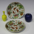 A pair of Chinese famille rose porcelain saucer dishes, mark of Chenghua but late 19th century, each painted with three central iron red bats framed by a border of fruit branches, including Buddha's hand citron, pomegranate and peach, divided by three gilt characters, iron red enamelled four character mark to bases, diameter 15cm (one with chip and hairline to rim), together with a blue glazed porcelain ovoid water coupe, underglaze blue seal mark to base, height 6.5cm, and a Chinese yellow glazed pottery vase, height 8.7cm.