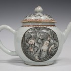 A Chinese export porcelain teapot and cover, Qianlong period, the globular body painted en grisaille with opposing circular panels of a European lady and gentleman, beneath an iron red and gilt barbed collar, the cover with flowers and barbed border, height 12.5cm (minor repair to tip of spout).