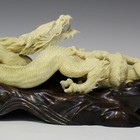 A Japanese carved ivory okimono figure group of two dragons, Meiji/Taisho period, finely carved and pierced in an entwined pose, incised signature to base, length 27cm, the hardwood stand of naturalistic rocky form, the front carved in relief with crashing waves, total length 33.5cm.