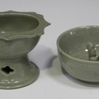 A Chinese celadon glazed footed oval bowl with shaped rim, on a pierced spreading foot, height 7.2cm, together with a celadon circular bowl, the interior applied with a praying figure, diameter 9.5cm.