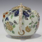 A Japanese Imari porcelain teapot and cover, early 18th century, the globular body relief moulded and painted with blossoming branches, the cover of kiku bud moulded form, flanked by a loop handle and later applied silver gilt conical spout, length 16.5cm, height 10.5cm (replacement spout and minor chips).