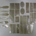 A collection of twenty-nine Chinese Canton mother-of-pearl gaming counters, mid/late 19th century, of various shapes and sizes including rectangular, oval and fish form, together with five Japanese lacquer small bowls/cups, each with gilt floral decoration on a dark brown ground with red interiors (minor faults).