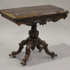 An early Victorian rosewood fold-over card table, the moulded top raised on a turned and reeded column issuing carved cabriole legs, height 74cm, width 91cm, depth 45cm.