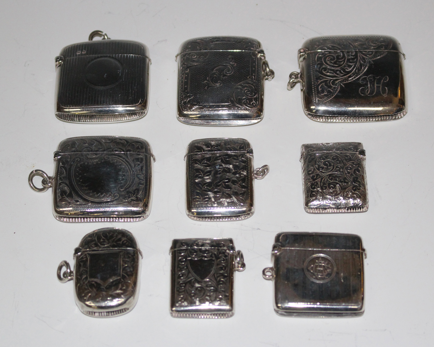 A late Victorian silver vesta case with banded decoration, Chester 1899 by George Unite, height 5cm, two Edwardian silver vesta cases, each with engraved decoration, Birmingham 1905 by Reynolds & Westwood and Birmingham 1905 by A.C. Jackson & Co, and six other similar silver vesta cases.
