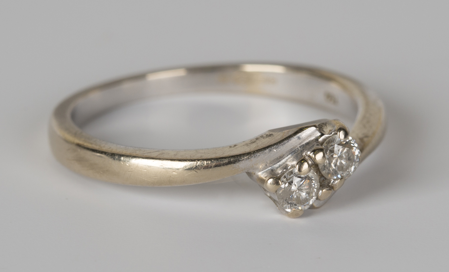 An 18ct white gold and diamond two stone ring, claw set with circular cut diamonds in a crossover design, detailed '0.15', ring size approx N.