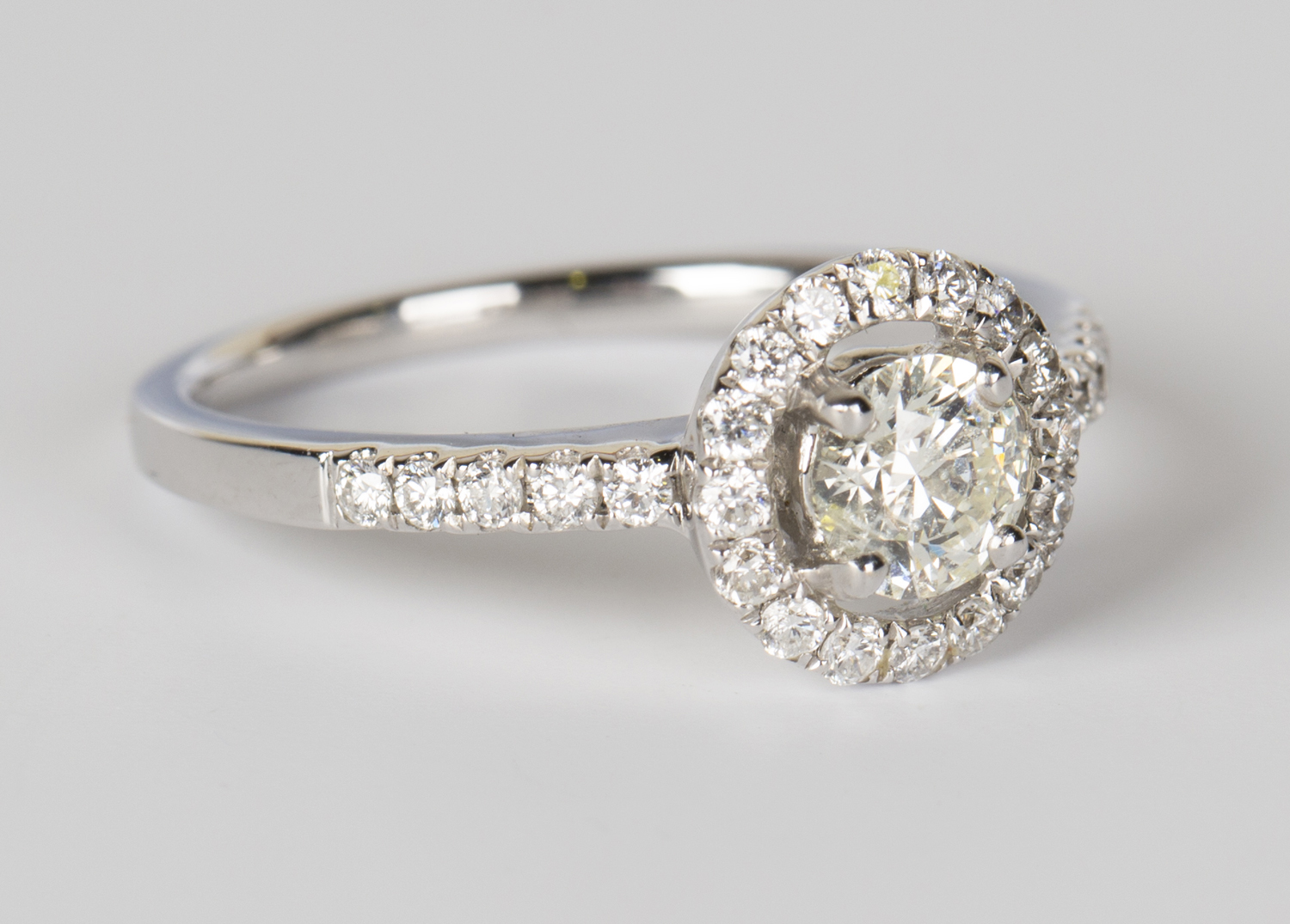 A white gold and diamond ring, claw set with the principal circular cut diamond within an openwork surround, set with circular cut diamonds, between diamond set five stone shoulders, detailed '18K 750', ring size approx M, principal diamond weight approx 0.45-0.50ct, with a case.