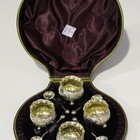 A set of four late Victorian silver circular salts, each with wavy rim, decorated in relief with flowers, scrolls and a vacant cartouche, raised on ball feet, with four matching condiment spoons, Birmingham 1892 and 1893 by Hayes Brothers, diameter of salt 3.8cm, cased.