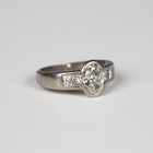 A platinum and diamond ring, collet set with the principal oval cut diamond between two pairs of princess cut diamonds, the shank unmarked, ring size approx K1/2, principal diamond weight approx 0.80-0.85ct, with a case.