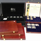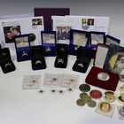 A group of seven gold 'World's Smallest Gold Coins', including Ludwig Van Beethoven and Julius Caesar, together with a collection of commemorative crown-size coins, other commemorative coins and a group of souvenir models of monarchs' crowns.