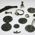 A small collection of bronze and other metal archaeological artifacts, including brooches, a bracelet and a small iron axe head.