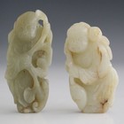 A Chinese pale celadon jade pendant, probably late Qing dynasty, carved in the form of a boy carrying a lotus stem and a fish, height 6cm, together with another celadon jade pendant, probably 20th century, in the form of a boy holding a lingzhi branch, height 6.6cm.