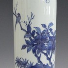 A Chinese blue and white porcelain vase, Transitional style but probably later, of shouldered tapering cylindrical form, painted with birds and blossoming branches above rocks, height 23.5cm.