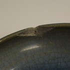 A Chinese Jun glazed circular dish, probably Qing dynasty, of shallow form, the interior with phosphatic 'T' shaped splash, diameter 12cm (chip to rim).
