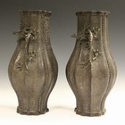 A pair of Chinese brown patinated bronze dragon-handled vases, late Qing dynasty, each lobed baluster body cast in low relief with a trellis ground, flanked by a pair of dragon handles, cast four character mark to bases, height 30.2cm.