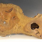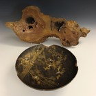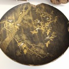 A Japanese lacquer circular footed dish, Meiji period, the interior gilt lacquered and bone inlaid with sparrows flying about and perched amongst pine branches, on a gilt speckled black ground, gilt signature to base, diameter 33cm (damaged and losses), together with a carved naturalistic burr wood stand, length 65cm.