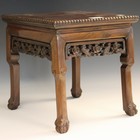 A Chinese hardwood stand, late Qing dynasty, the square top with beaded edge above a carved and pierced bird and prunus apron, on carved scroll legs terminating in claw and ball feet, height 28.5cm.