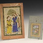A Persian miniature watercolour painting, late 19th/early 20th century, depicting two figures sharing wine, standing beneath a tree and clouds, 22.5cm x 13.5cm, unframed, together with another Persian miniature painting depicting a scene of figures outside a tent within a floral and gilt scrolling tendril border, 19cm x 12cm, and a Persian watercolour painting/manuscript leaf, late 19th century, depicting a seated dignitary, standing attendant and two seated musicians within borders of black script, 31cm x 17cm, framed and glazed.