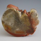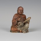 A Chinese carved soapstone figure of a seated gentleman, probably 20th century, finely modelled in a seated pose wearing a long robe embellished with turquoise beading, holding an upturned vase in his left hand, the stone of mottled pale green and iron red tone, height 10.5cm (minor repair to hand).