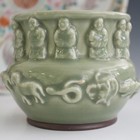 A Chinese famille rose millefleurs porcelain circular dish, mark of Qianlong but late 19th century, painted with a gilt shou medallion within a border of four circular phoenix panels, all reserved against a dense floral ground, iron red painted six character mark to base, diameter 34cm (repaired), together with a similarly decorated dish, painted with flowers on a black ground, diameter 33cm, and a celadon glazed pot, moulded in relief with bands of figures and zodiacal animals, height 10.1cm.