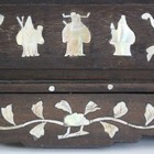 A Chinese mother-of-pearl inlaid hardwood table screen and stand, early 20th century, the rectangular glazed frame inlaid with foliage framing a silk embroidered panel depicting birds and flowers, the stand with similarly inlaid decoration, height 59cm.