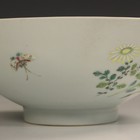 A Chinese famille rose enamelled porcelain bowl, Yongzheng period, of hemi-spherical form, the exterior finely enamelled with polychrome flower sprays and a butterfly, underglaze blue pseudo seal mark within double ring to base, diameter 19.6cm (minor restoration).