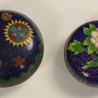 A Japanese cloisonné vase and cover, Meiji period, of flattened oval shape, decorated with birds on a leafy branch against a turquoise ground, the cover with pierced gilt finial, height 16cm, together with four pieces of Chinese cloisonné, comprising two vases and two boxes and covers.