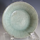 A Chinese celadon glazed circular dish, Ming dynasty, the centre carved in low relief with peony and leaves, within a foliate moulded rim, diameter 31cm.