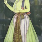 An Indian Mughal School watercolour and gouache painting, 20th century, depicting a full-length portrait of a standing prince, 86cm x 56cm, framed and glazed, together with a Mughal miniature painting depicting figures in an interior setting, 11cm x 7cm, framed and glazed.