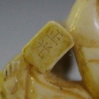A Japanese carved ivory netsuke, Meiji period, modelled as a standing maiden leaning against the back of a seated oni, incised two character signature to base, height 3.5cm.