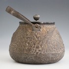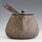 A Japanese inlaid iron tetsubin (tea kettle), Meiji period, the squat circular body cast in textured relief framing opposing panels, one depicting a crab and rocks, the other with iris, each picked out in gilt, flanked by a short spout, with inlaid overhead swing handle, the brown patinated bronze cover with silvered kiku bud finial, the underside with incised and gilt four character signature, height 16cm.