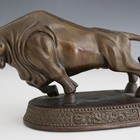A Chinese brown patinated bronze figure of a bull, mid-20th century, the oval stand decorated in relief with lotus and tendril panels against a 'Y' diaper ground with beaded borders, length 21.7cm.